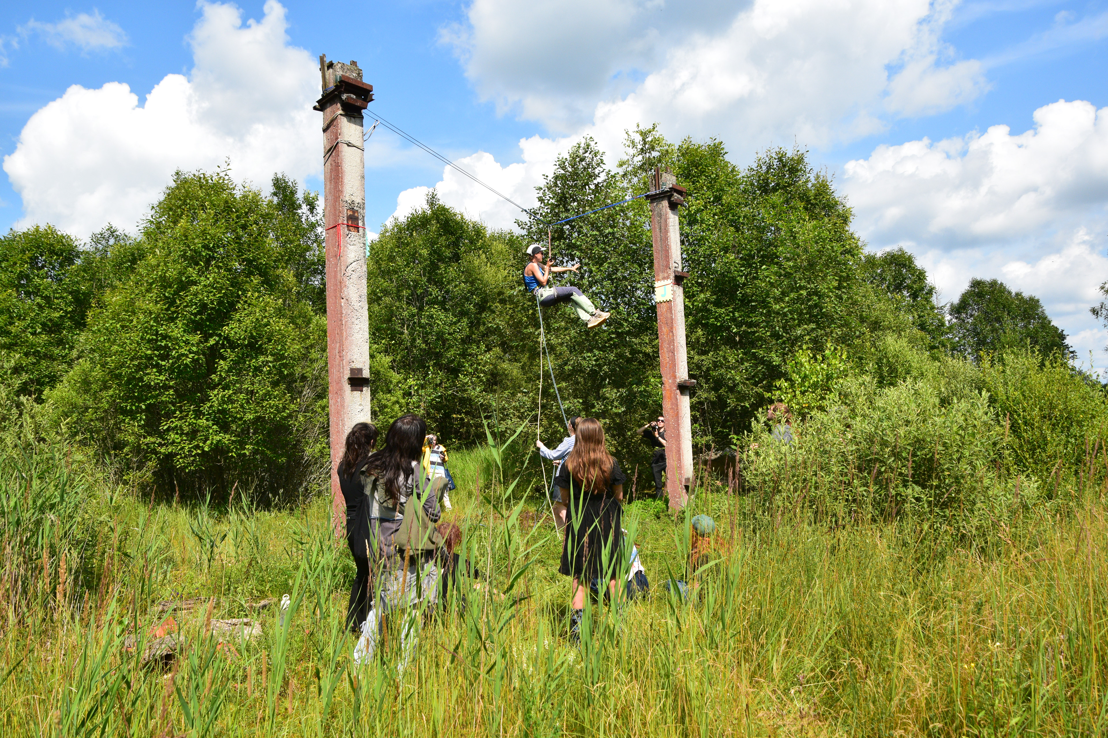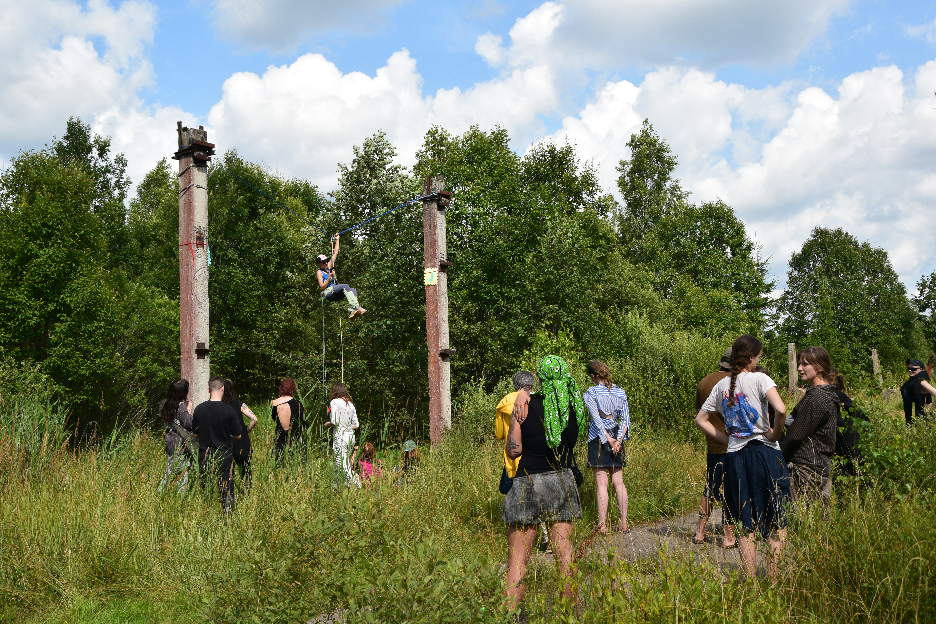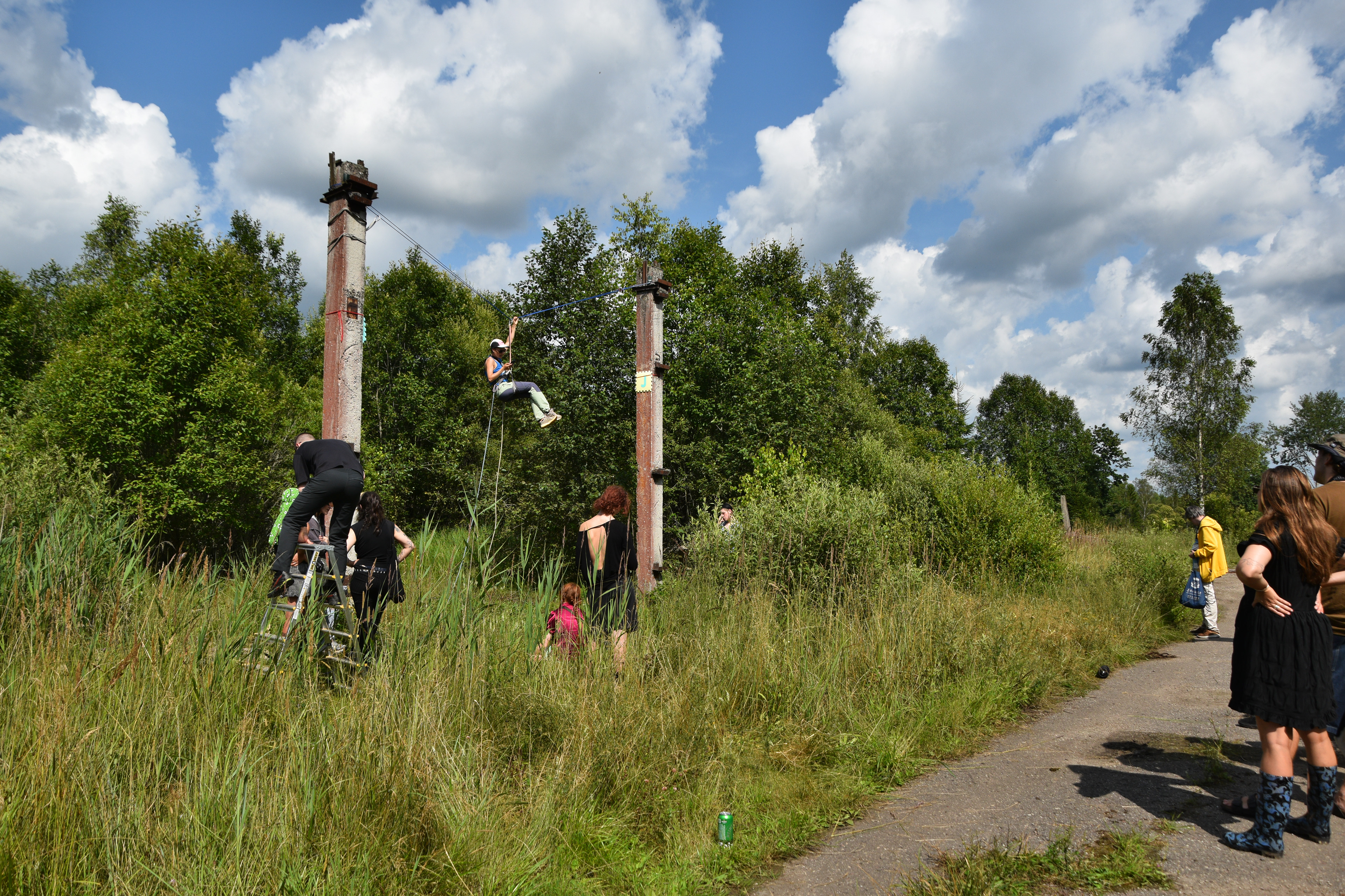 The performance took place as part of an art plein-air Simbioze 2.0 under the guidance of Dutch performance artist Lisette Ros. Suspended approximately four meters above the ground between two concrete pillars, I positioned myself in a state of physical and conceptual tension — held by two ropes, one on each side.